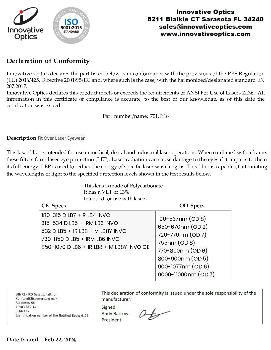 Laser Type: Argon (515 nm OD 8), Blue light laser (450 – 480 nm OD 8), CO2 (10600 nm OD 7), Diode (940 nm OD 6), Disc (1030 nm OD 6), Excimer (193 nm OD 7), Faser (976 – 1080 nm OD 6), Nd:YAG (1064 nm OD 6), KTP (532 nm OD 8), Nd:YAG 3x (355 nm OD 8), UV (248 nm OD 8)