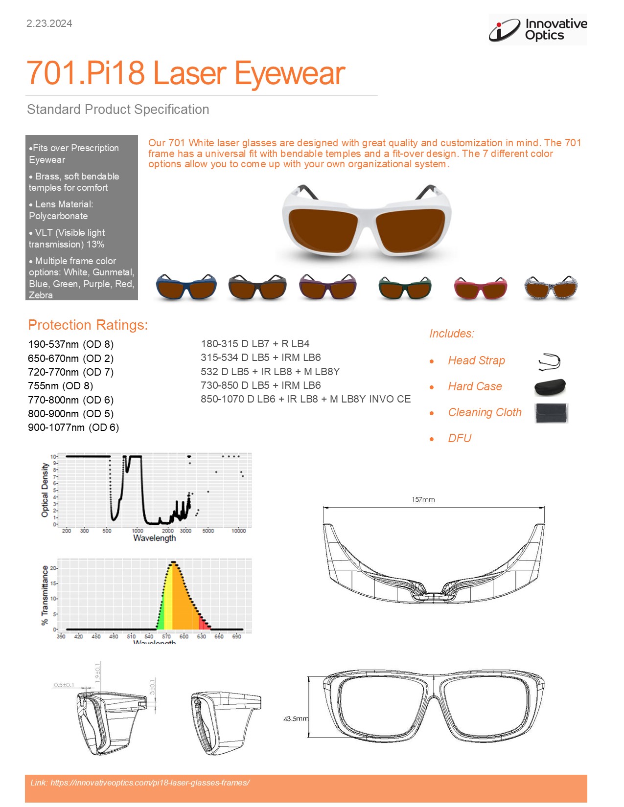Our 701 Pi18 White laser glasses are designed with great quality and customization in mind. The 701 frame has a universal fit with bendable temples and a fit-over design. The 7 different color options allow you to come up with your own organizational system.
